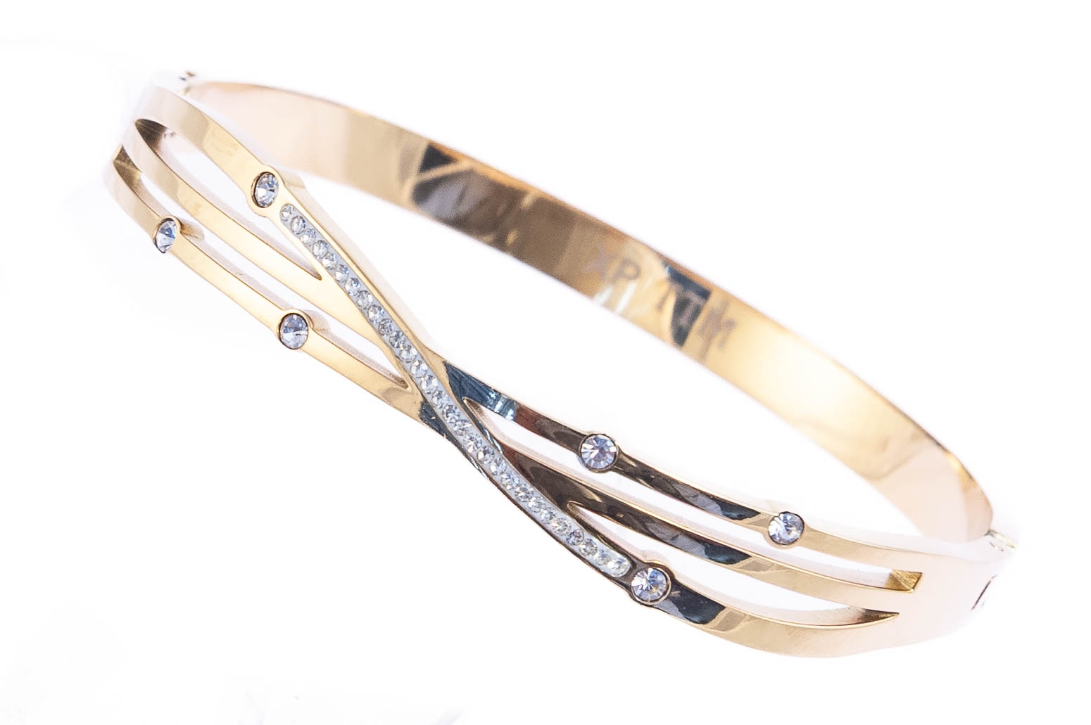 Elegancka, sztywna bransoletka. Bransoletka jest w kolorze złotym i ozdobiona jest mieniącymi się dżetami.Wymiary bransoletki: