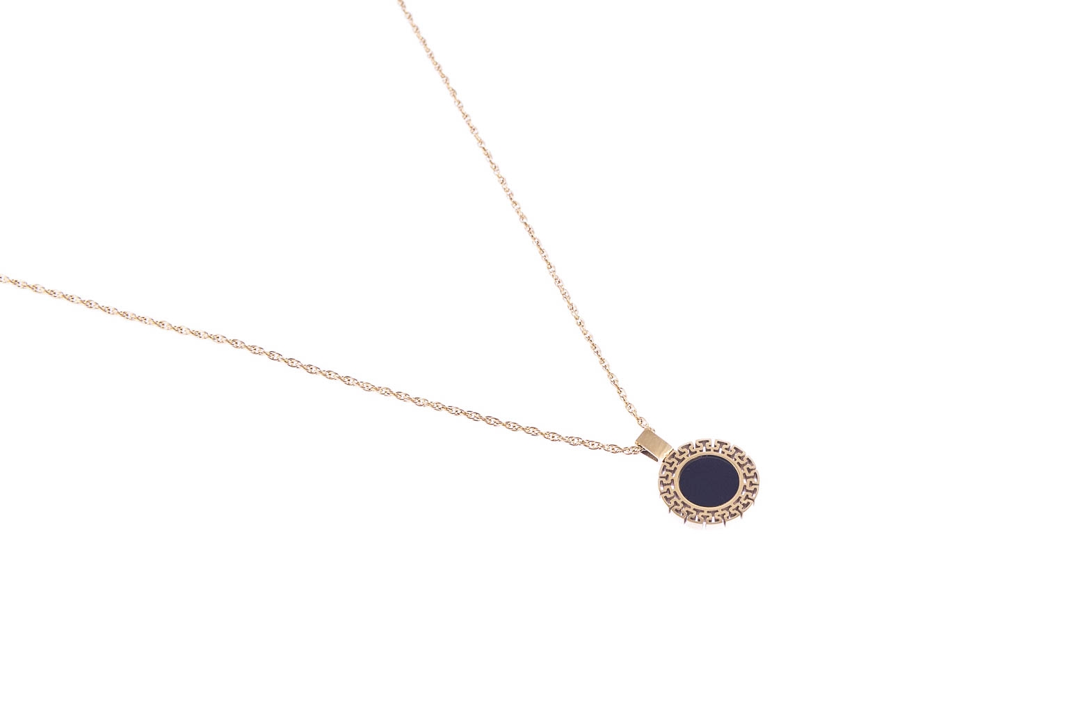 Elegancki łańcuszek z przywieszką ozdobioną pięknie czarną emalią. Naszyjnik jest w kolorze złotym.Wymiary naszyjnika: