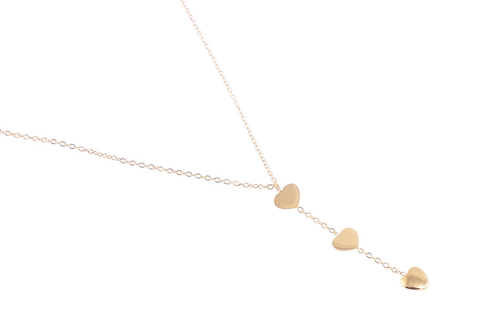Elegancki łańcuszek z uroczymi przywieszkami w kształcie serduszek. Naszyjnik jest w kolorze złotym.Wymiary naszyjnika: