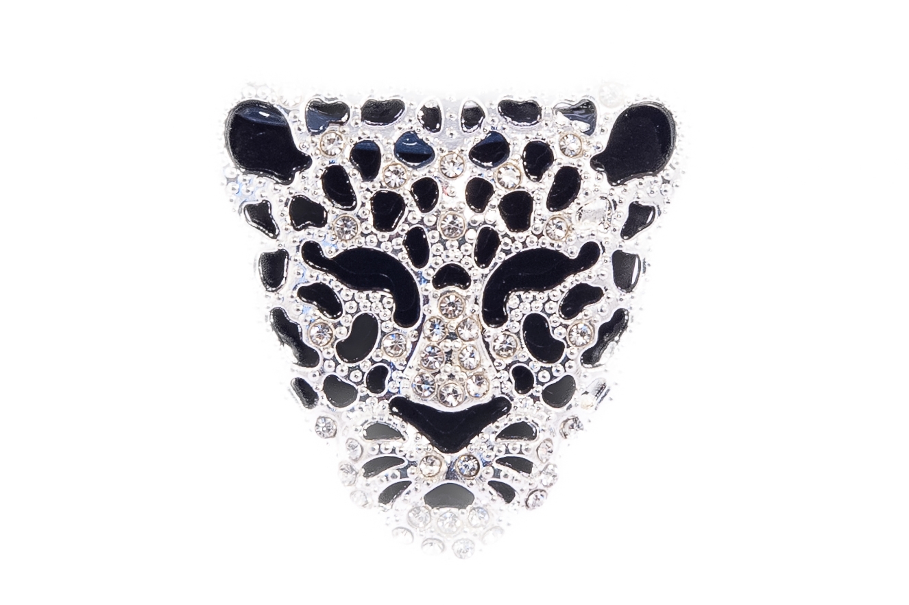 Elegancka ozdoba maskująca guzik mankietowy w kształcie pantery. Ozdoba w kolorze srebrnym, ozdobina szlifowanymi kamieiami.