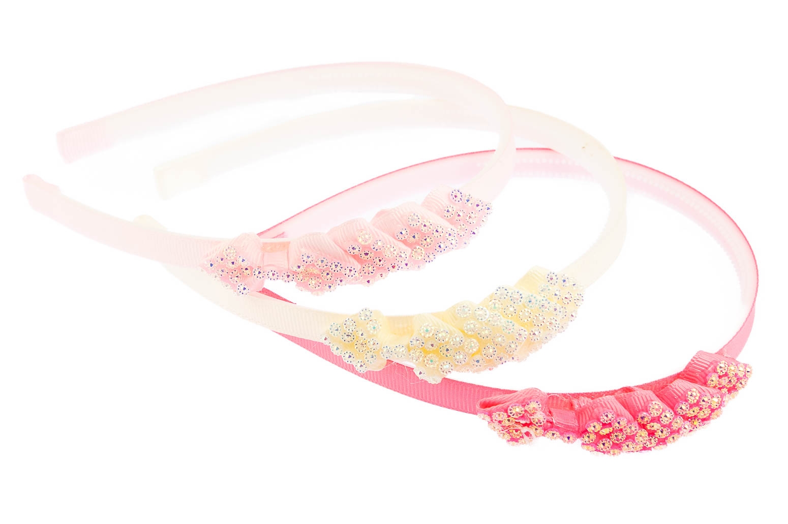 Opaska pokryta materiałem, ozdobiona uroczymi kokardkami.Zestaw składa się z trzech kolorów: biały, jasny i ciemny różowy.