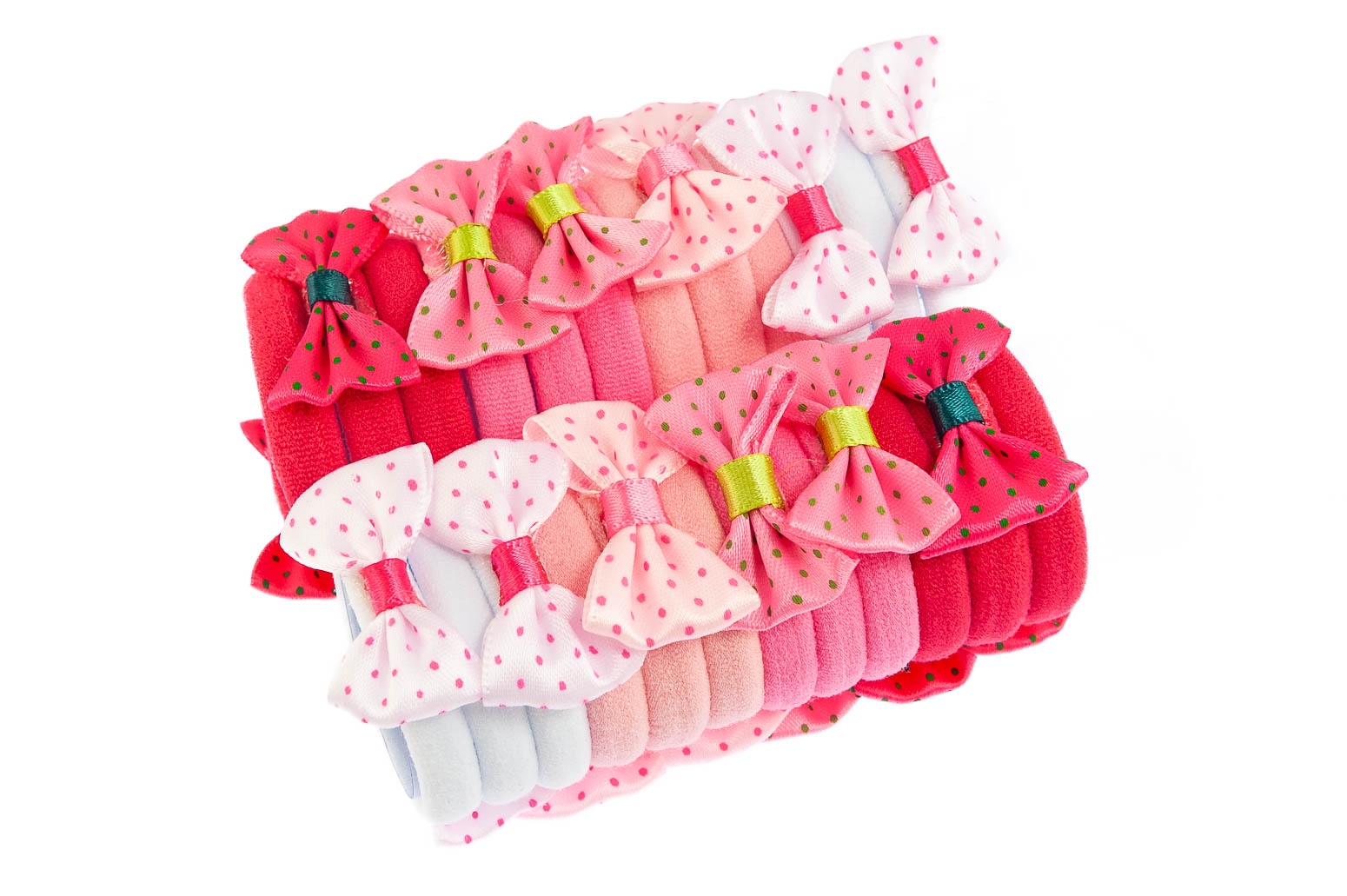 Klasyczne gumki do włosów z uroczą ozdobą w kształcie kokardki.Zestaw składa się z czterech kolorów: biały, morelowy, jasny i ciemny różowy.