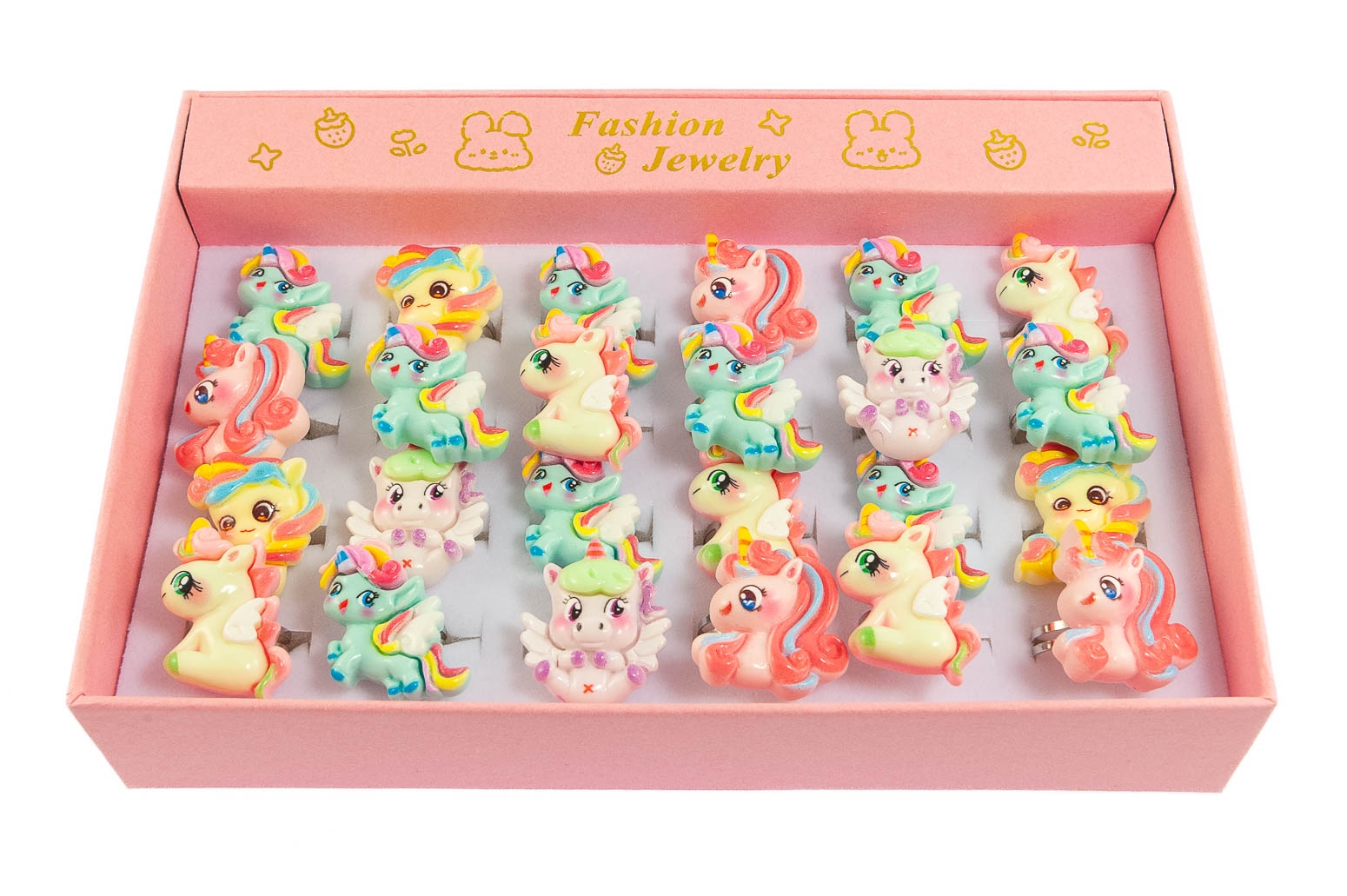Dziecięce pierścionki w kolorze srebrnym z kolorowymi jednorożcamiPierścionki posiadają regulację średnicy.