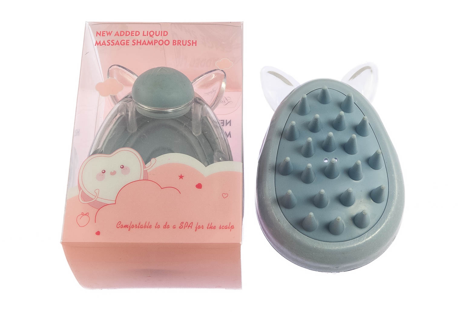 Masażer do skóry głowy, który posiada dozownik płynu.Przedmiot jest w kolorze jasno szarym.