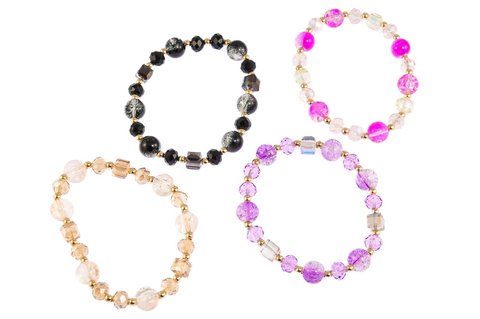 Elegancka bransoletka wykonana ze szlifowanych koralików i koralików z pękanego szkła.Zestaw składa się z czterech kolorów: beżowy, różowy, czarny i fioletowy.