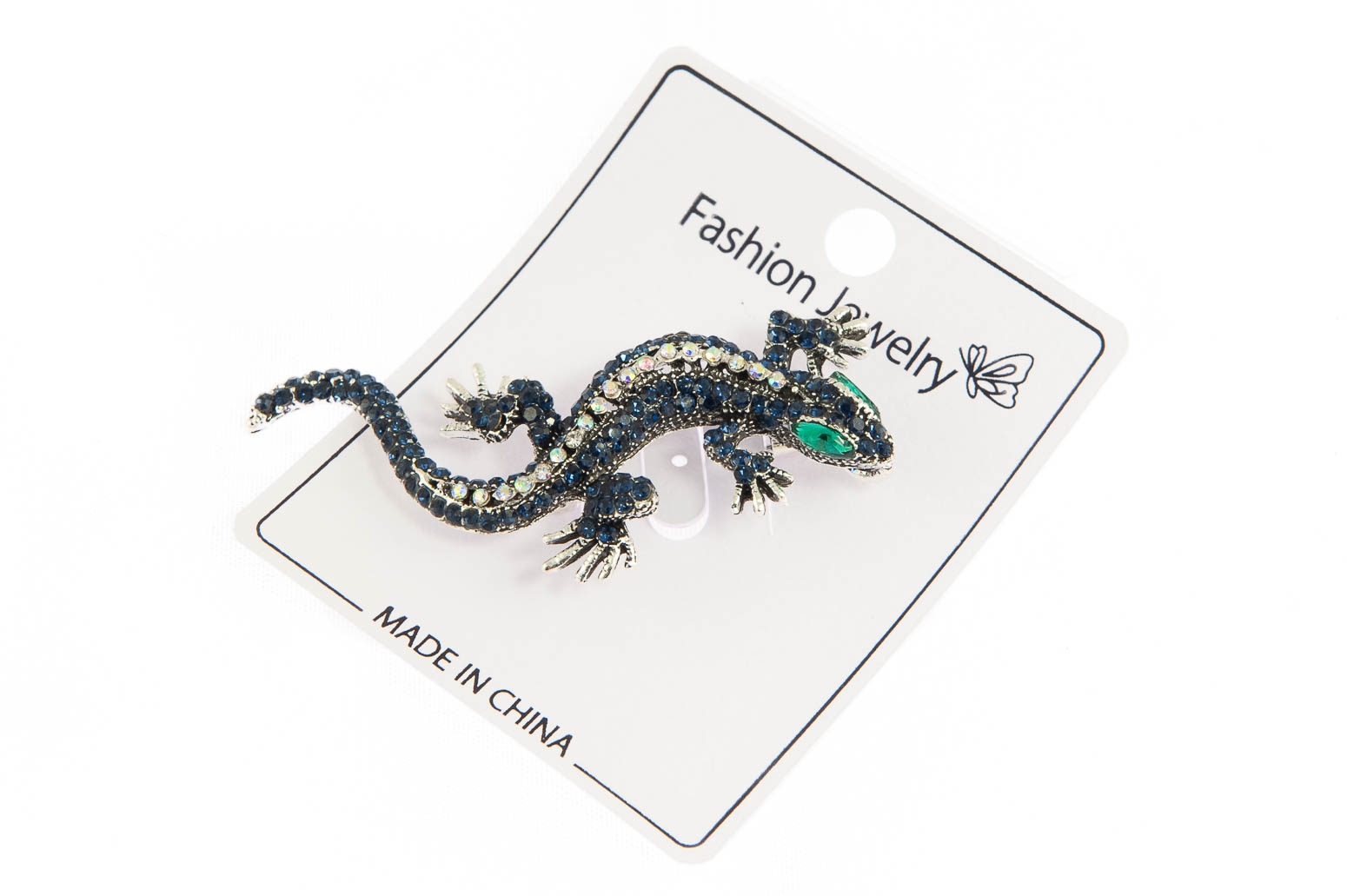 Elegancka broszka w kształcie jaszczurki. Przywieszka w kolorze grafitowym, ozdobiona szlifowanymi kamieniami.Ozdoba doda szyku każdej stylizacji.