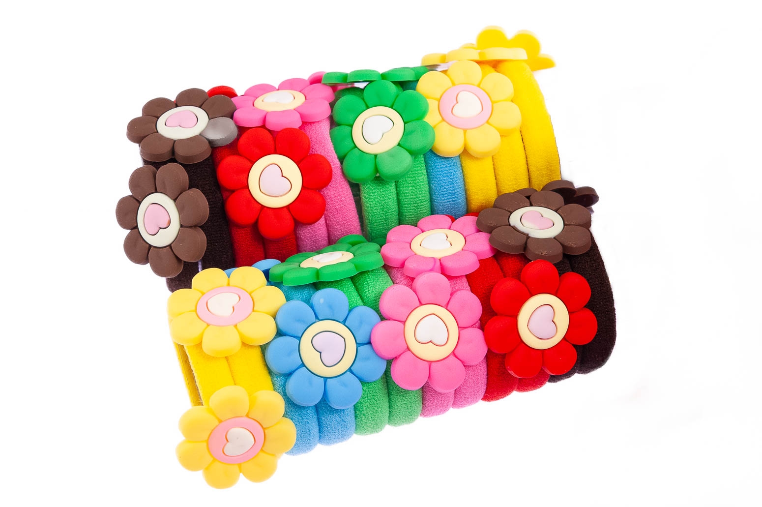 Klasyczne gumki do włosów z uroczą ozdobą w kształcie kwiatka.Zestaw składa się z sześciu kolorów: brązowy, czerwony, zielony, niebieski, żółty i różowy.