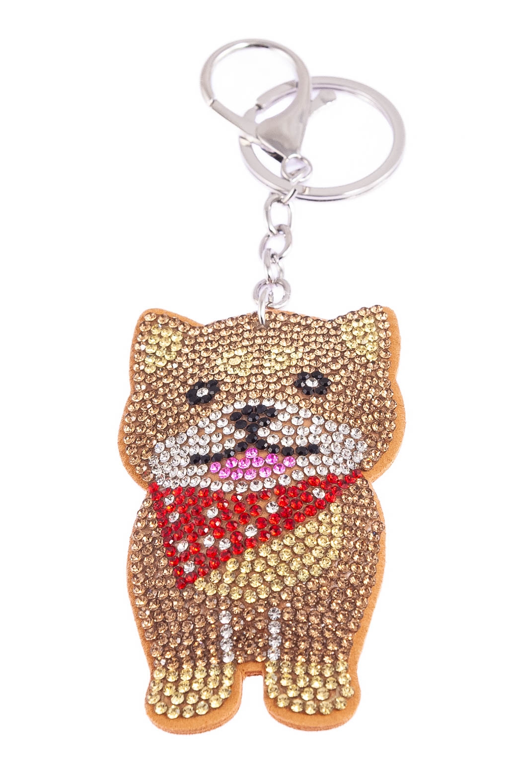 Elegancki brelok w kształcie pieska, ozdobiony dżetami w kolorze beżowym i czerwonym.Brelok idealnie nada się na prezent, który ucieszy każde dziecko.