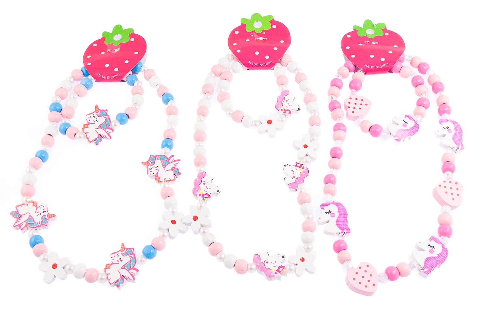 Komplet biżuterii dziecięcej, składający się z naszyjnika i bransoletki.Biżuteria wykonana z perełek i uroczych koralików w kształcie jednorożców, kwiatków i serduszek.