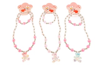 Komplet biżuterii dziecięcej, składający się z naszyjnika i bransoletki.Biżuteria wykonana z perełek i uroczych koralików w kształcie motylków, kwiatków i serduszek.