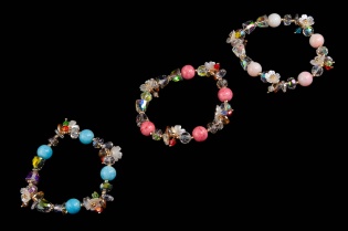 Elegancka bransoletka wykonana z koralików i przywieszki.Zestaw składa się z trzech kolorów: beżowy, różowy i niebieski.