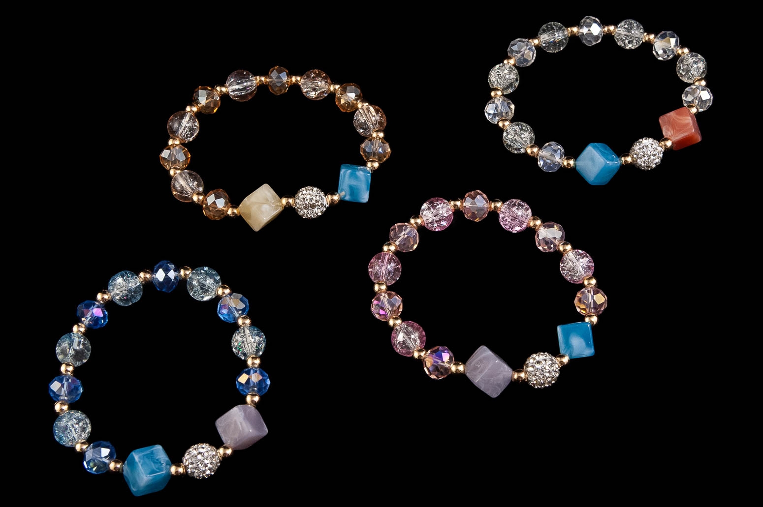 Elegancka bransoletka wykonana ze szlifowanych koralików i kostek.Zestaw składa się z czterech kolorów: różowy, niebieski, beżowy i biały.