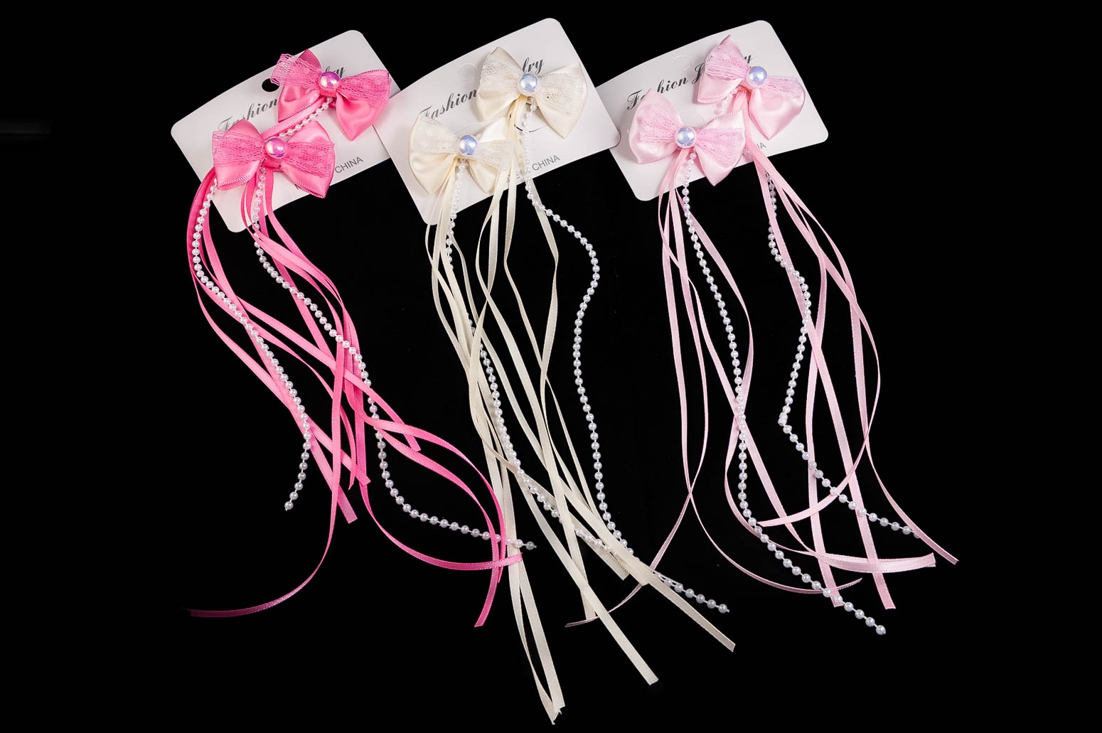 Klasyczne spinki z elegancką kokardą i uroczymi frędzelkami,.Zestaw składa się z trzech kolorów: beżowy, jasny i ciemny różowy.