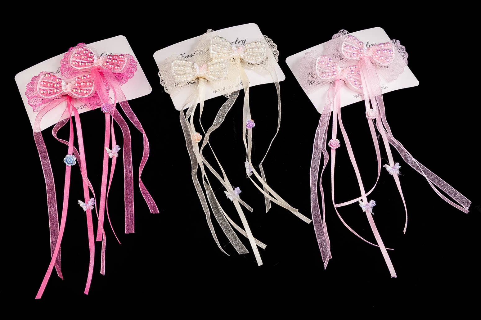 Klasyczne spinki z elegancką kokardą i uroczymi frędzelkami,.Zestaw składa się z trzech kolorów: beżowy, jasny i ciemny różowy.