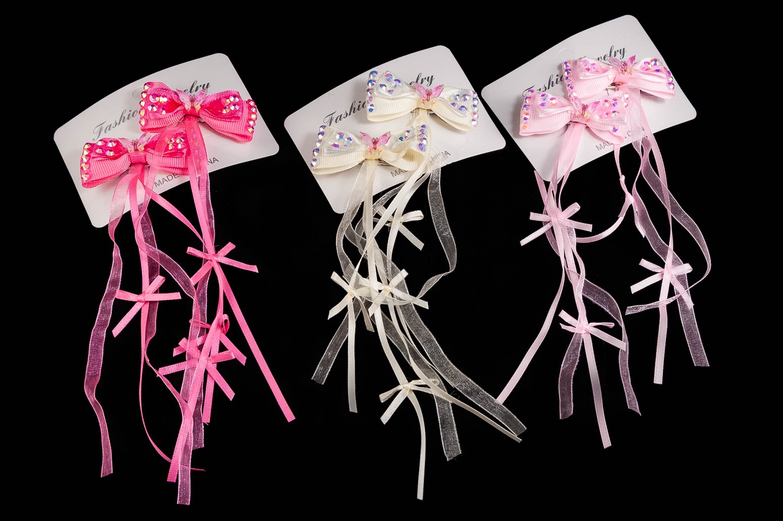 Klasyczne spinki z elegancką kokardą i uroczymi frędzelkami,.Zestaw składa się z trzech kolorów: beżowy, jasny i ciemny różowy.