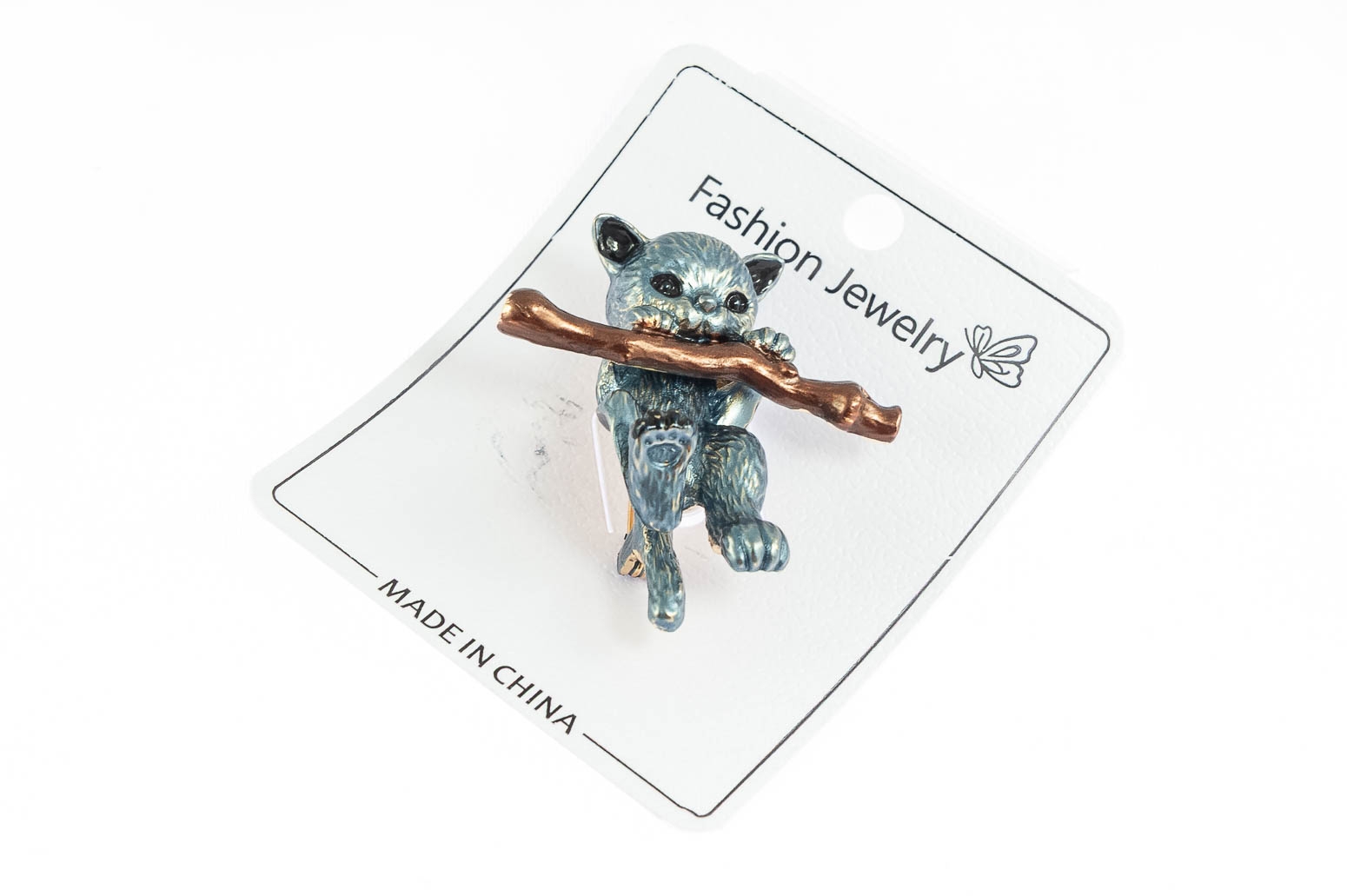 Elegancka broszka w kształcie kota. Przywieszka ozdobiona szarą i brązową emalią.Ozdoba doda szyku każdej stylizacji.