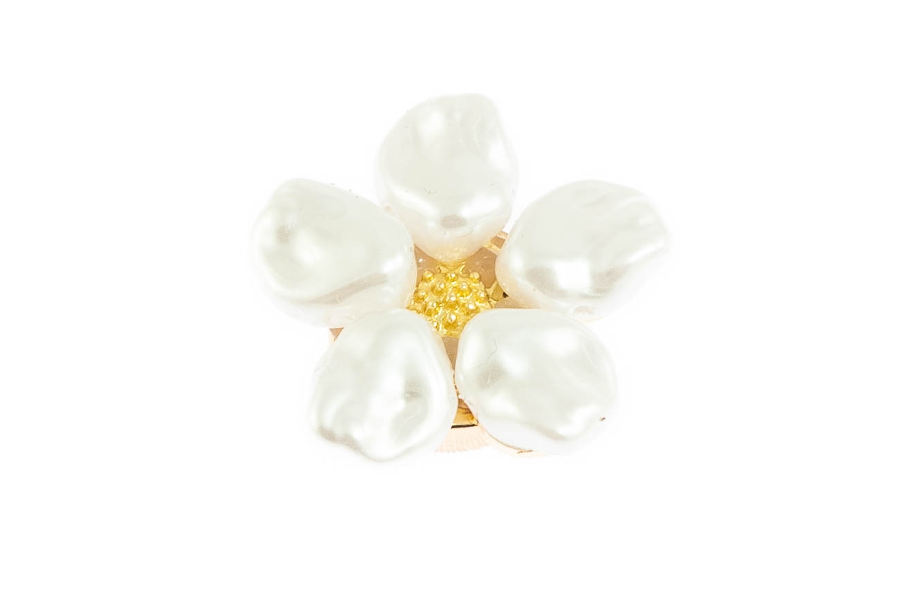 Elegancka ozdoba maskująca guzik mankietowy w kształcie kwiatka. Przypinka w kolorze złotym, ozdobiona perłami.Ozdoba doda szyku każdej stylizacji.