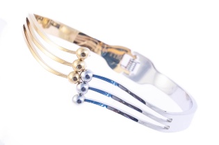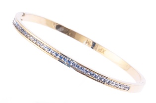 Elegancka, sztywna bransoletka. Bransoletka jest w kolorze złotym i ozdobiona jest mieniącymi się dżetami.Wymiary bransoletki: