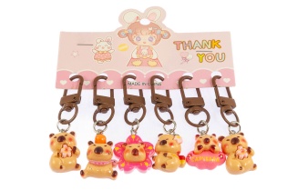 Uroczy brelok w kształcie kapibary w kolorze brązowym.Brelok posiada mechanizm, dzięki któremu po pociagnieciu za sznureczek kapibarze trzęsą się uszy