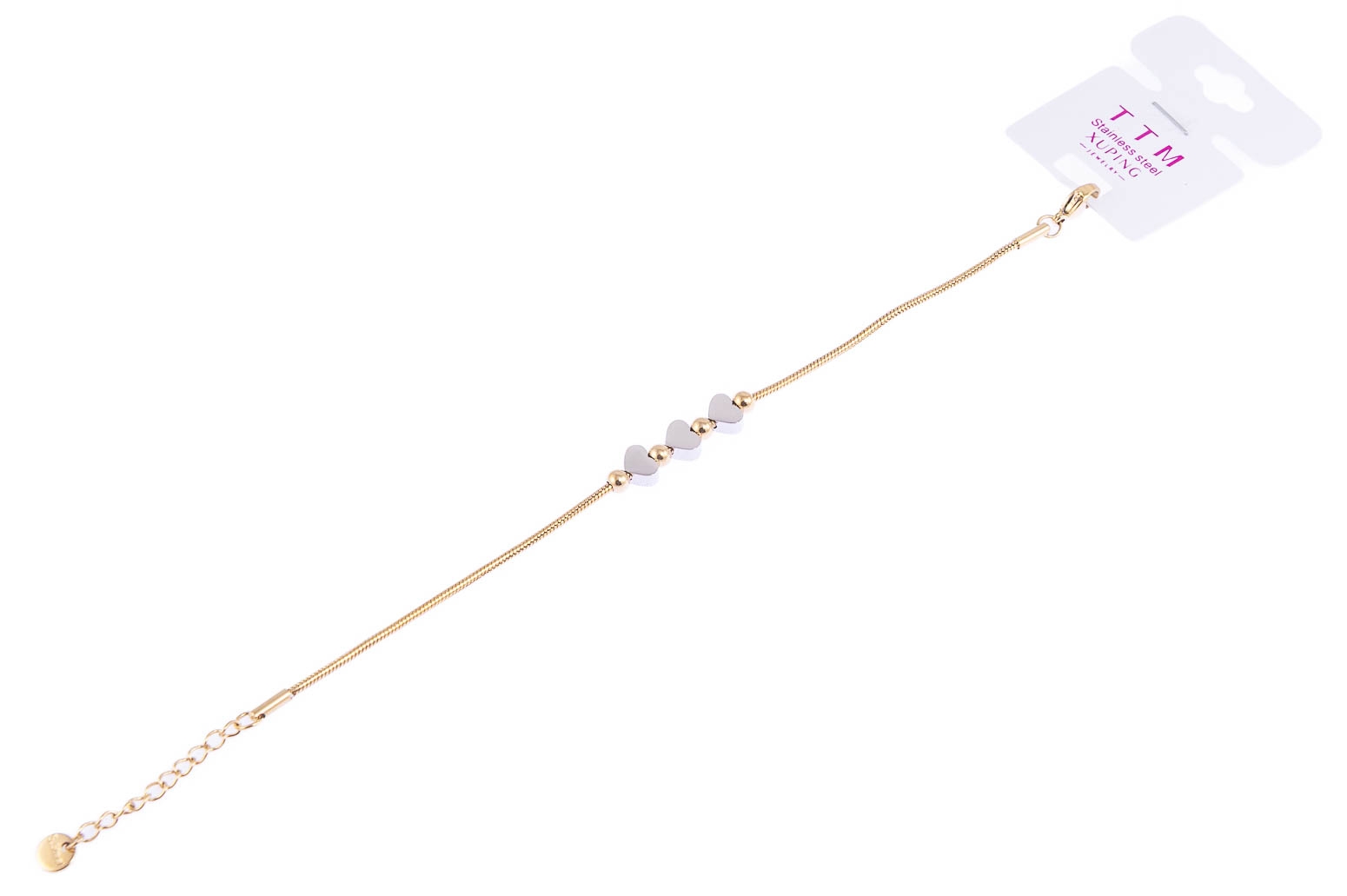 Elegancka bransoletka z uroczymi ozdobami w kształcie serduszek w srebrnym kolorze. Bransoletka jest w kolorze złotym.Wymiary bransoletki: