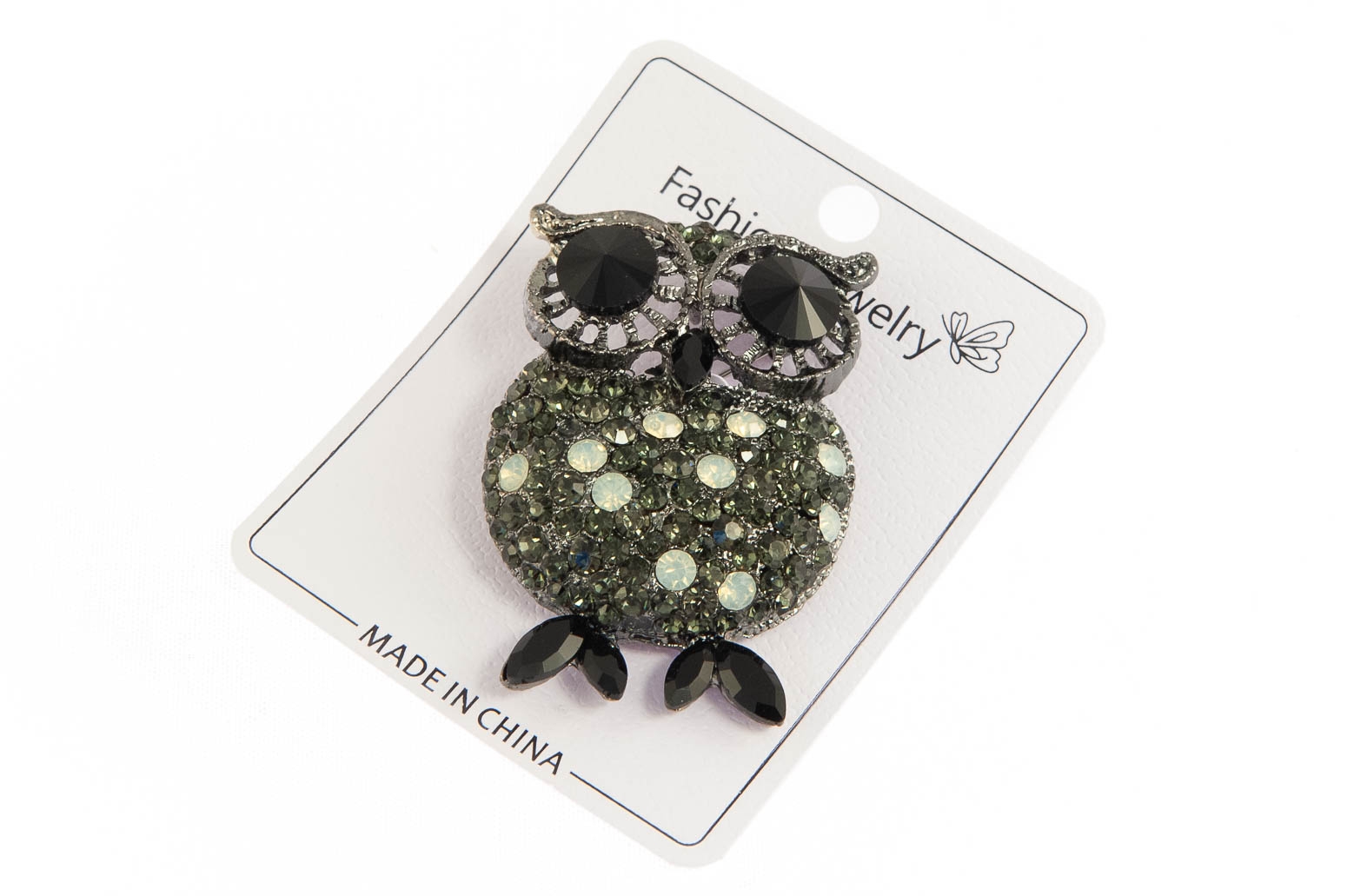 Elegancka broszka w kształcie sowy. Przywieszka w kolorze grafitowym, ozdobiona szlifowanymi kamieniami.Ozdoba doda szyku każdej stylizacji.