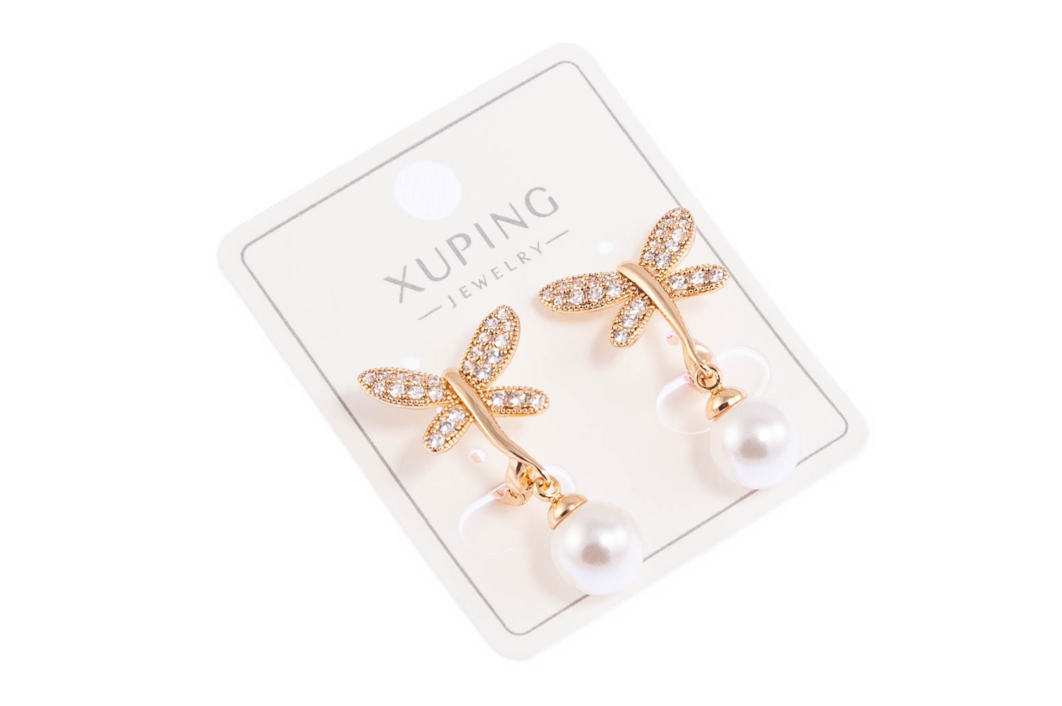 Eleganckie, wiszące kolczyki w kształcie ważek. Kolczyki są w kolorze złotym z białymi perłami.Wymiary kolczyków: