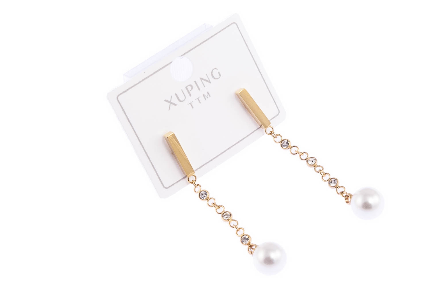 Eleganckie, wiszące kolczyki, ozdobine perłami i mieniącymi się kamieniami. Kolczyki w kolorze złotym.Wymiary kolczyków: